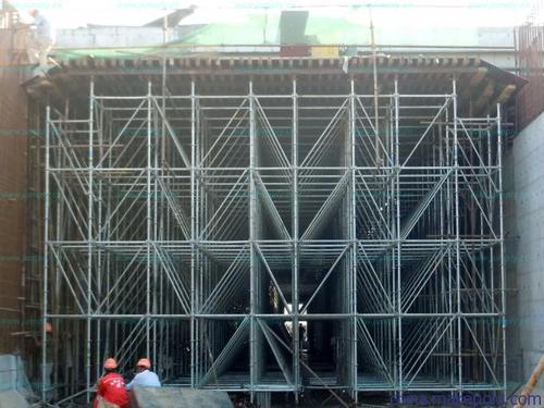 碗扣式钢管脚手架优点 1)多功能:能根据具体施工要求,组成不同组架尺寸、形状和承载能力的单、双排脚手架,支撑架,支撑柱,物料提升架...